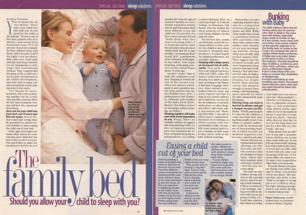 This article on co-sleeping, published in the July 1996 issue of Parents, was part of a cover package that won a 1997 Gold National Health Information Award honoring the nation’s best consumer health information programs and materials.